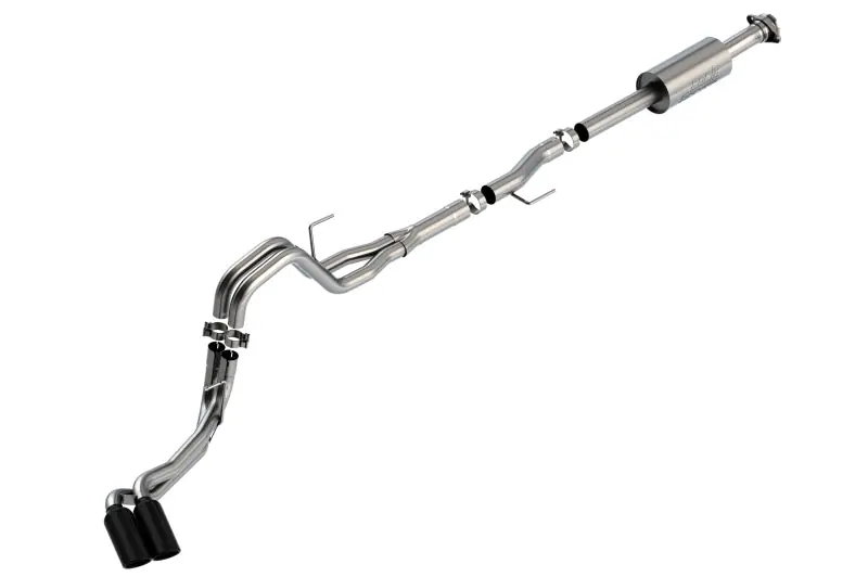 The 3″ into dual 2.25″ Borla(r) Cat-Back(tm) system was specifically designed to enhance the power and sound of the Ford F-150 equipped with 2.7L and 3.5L engines. The dual side (passenger side) exit configuration replaces the single factory tail pipe, and has single 4″ round black chrome on T-304 stainless steel tips on each tail pipe. Using Borla(r) Stainless Steel Polish p# 21461 is NOT recommended with these black chrome tips. We suggest cleaning the tips with hot water and a microfiber cloth. A system with bright chrome on Tt-304 stainless steel tips is also available. This system features the popular S-Type sound with no drone. Additional systems are available with different options for sound level, tip finish and tip exits. Add Adapter 60556 for Crew Cab with Standard Bed (6′ 7″) 157.2″ Wheelbase vehicles. Add Adapter 60564 for Extended Cab with Long Bed (8′ 2″) 164.1″ Wheelbase vehicles. Borla(r) Cat-Back(tm) & Axle-Back exhaust systems feature patented straight-through and multi-core technology to unleash hidden horsepower. Increased exhaust velocity adds power, driving excitement, fuel economy, and the distinctive Borla(r) Sound of Power respected by motoring enthusiasts everywhere. Each system is built from premium, high-quality T-304 austenitic stainless steel, superior to T-400 series knockoffs (such as 409), to give you the absolute best in performance and durability. Ultra-smooth mandrel bends ensure maximum flow & power, and precision computer numerical control (CNC) manufacturing ensures an accurate fit. All this is backed by our unsurpassed Million Mile Warranty. System Features: Cat-Back(tm) System Dual Side Exit 4″ Round Black Chrome On T-304 Stainless Steel Tips S-Type Sound Level T-304 Stainless Steel Construction Bolt-On Installation Million Mile Warranty