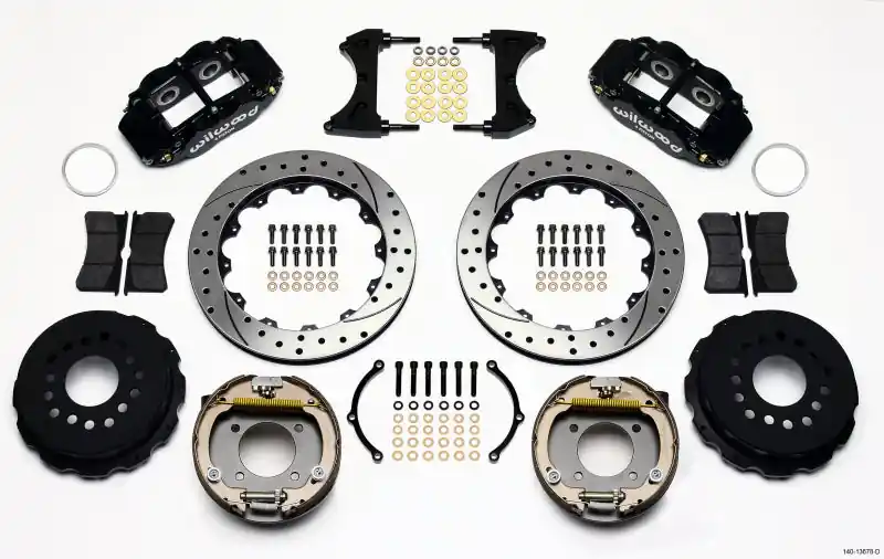Forged Narrow Superlite 4R rear disc kits provide the ultimate Big Brake solution for popular muscle car rear axles that require a parking brake. FNSL4R four piston calipers, 13” or 14” two-piece rotors, and high performance BP-10 compound pads provide optimized and balanced braking to compliment front big brake upgrad